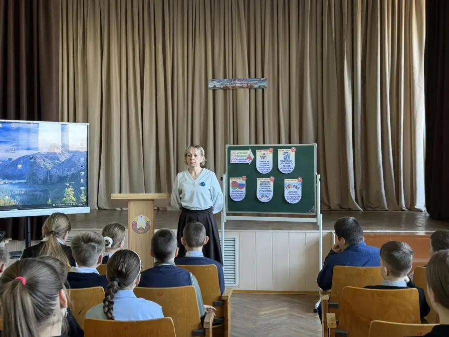 2 апреля наша школа присоединилась к празднованию Дня единения народов Беларуси и России. В этот день для учащихся 5-11 классов прошёл Единый урок, посвящённый дружбе и общим историческим корням двух государств. В ходе урока учащиеся узнали,что праздник был утверждён в честь подписания договора об образовании Сообщества России и Беларуси(1996 год). Сегодня наши страны связывают не только общая история(совместная победа в Великой Отечественной войне, освоение космоса), но и равные права граждан на образование, трудоустройство и социальную защиту на территории обеих стран. Завершился Единый урок выводом: "Сильны мы тогда, когда мы вместе".